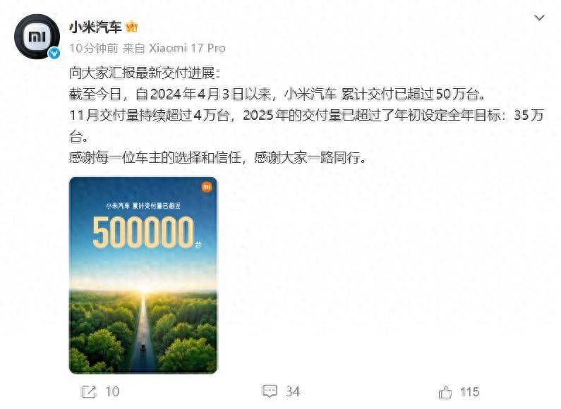 据小米汽车官微,规矩当天体育游戏app平台,自2024年4月3日以来,小米汽车累计寄托已朝上50万台。11月寄托量握续朝上4万台,2025年的寄托量已朝上了岁首设定全年野心:35万台。